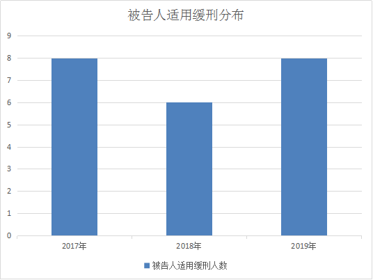 2017年至2019年,未成年人犯罪37案58人,其中19案23人适用缓刑,被告人缓刑适用率39.66%。适用缓刑无法使未成年被告人充分体会到刑罚的严厉性,无法真正认清其行为性质。根据刑法的有关规定及未成年人犯罪“教育为主,惩罚为辅”的原则,未成年人犯罪适用缓刑率较高。对被告人而言,较高的缓刑适用率主要体现“教育为主”,体现刑罚严厉性的“惩罚为辅”不多,犯罪无法有效的区别于一般行政治安处罚,让未成年被告人充分认识到自身犯罪行为性质的严重性。